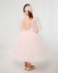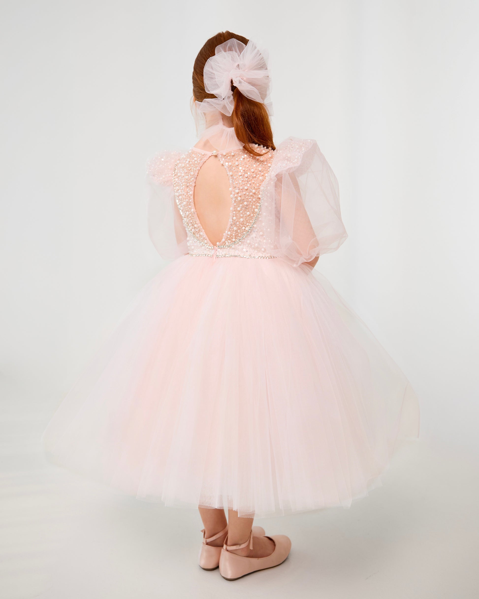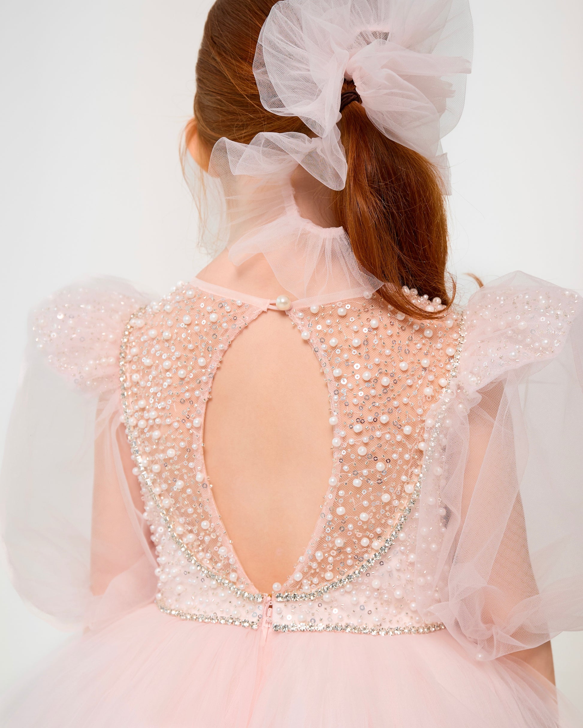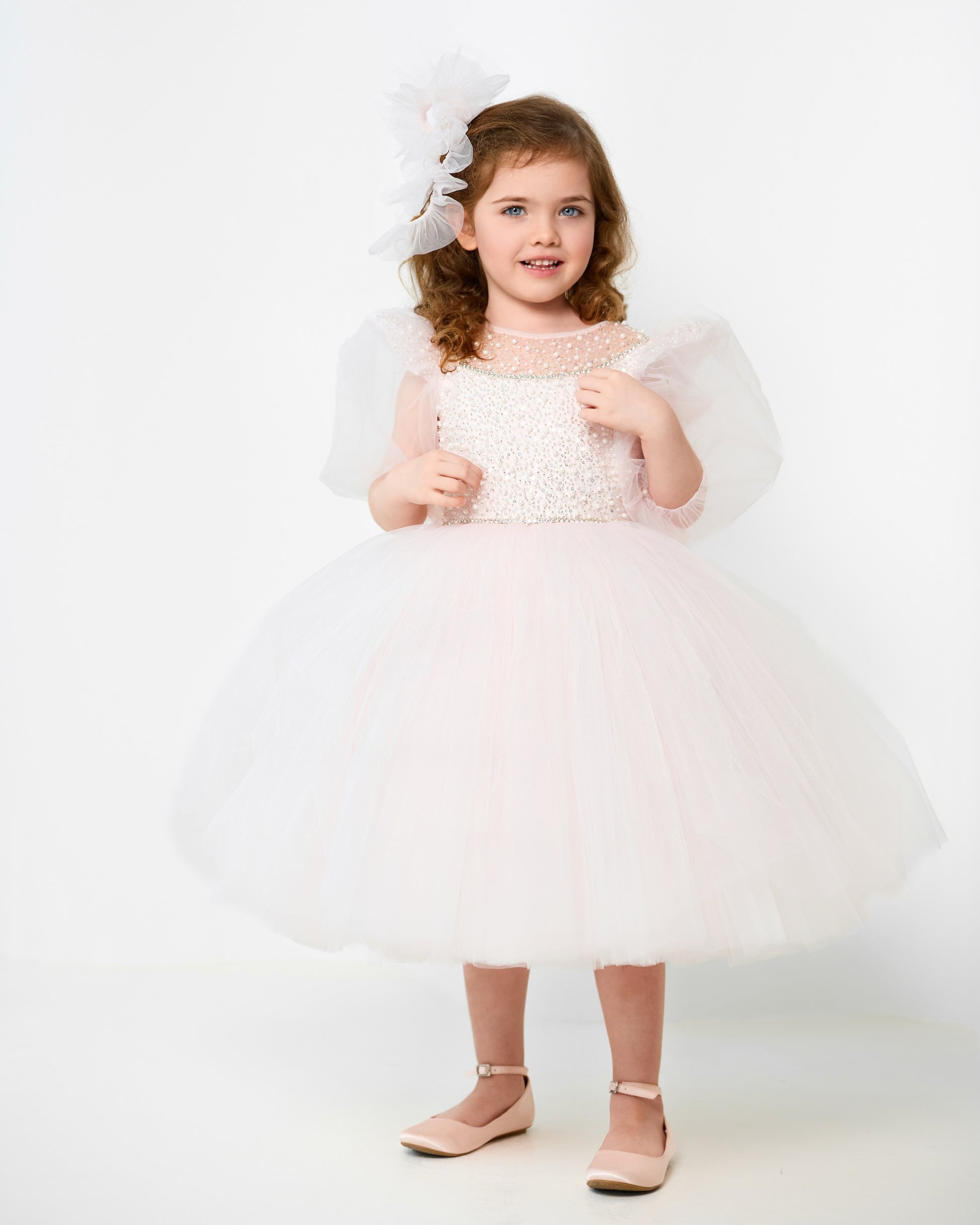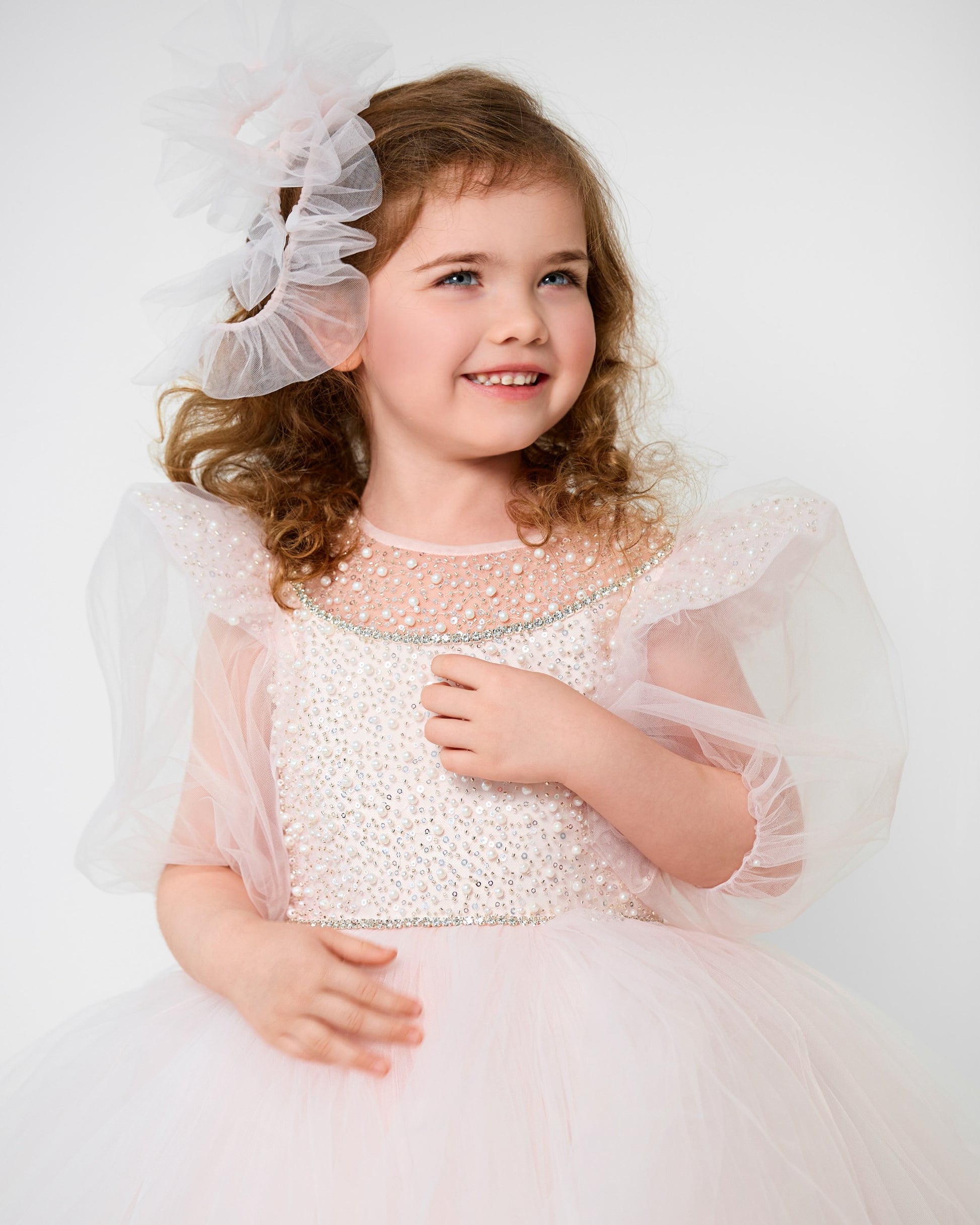 Elegant pearl-embellished kids dress featuring a soft tulle skirt, puff sleeves, and a delicately beaded bodice. Finished with a gentle blush tone and a matching tulle hair accessory.