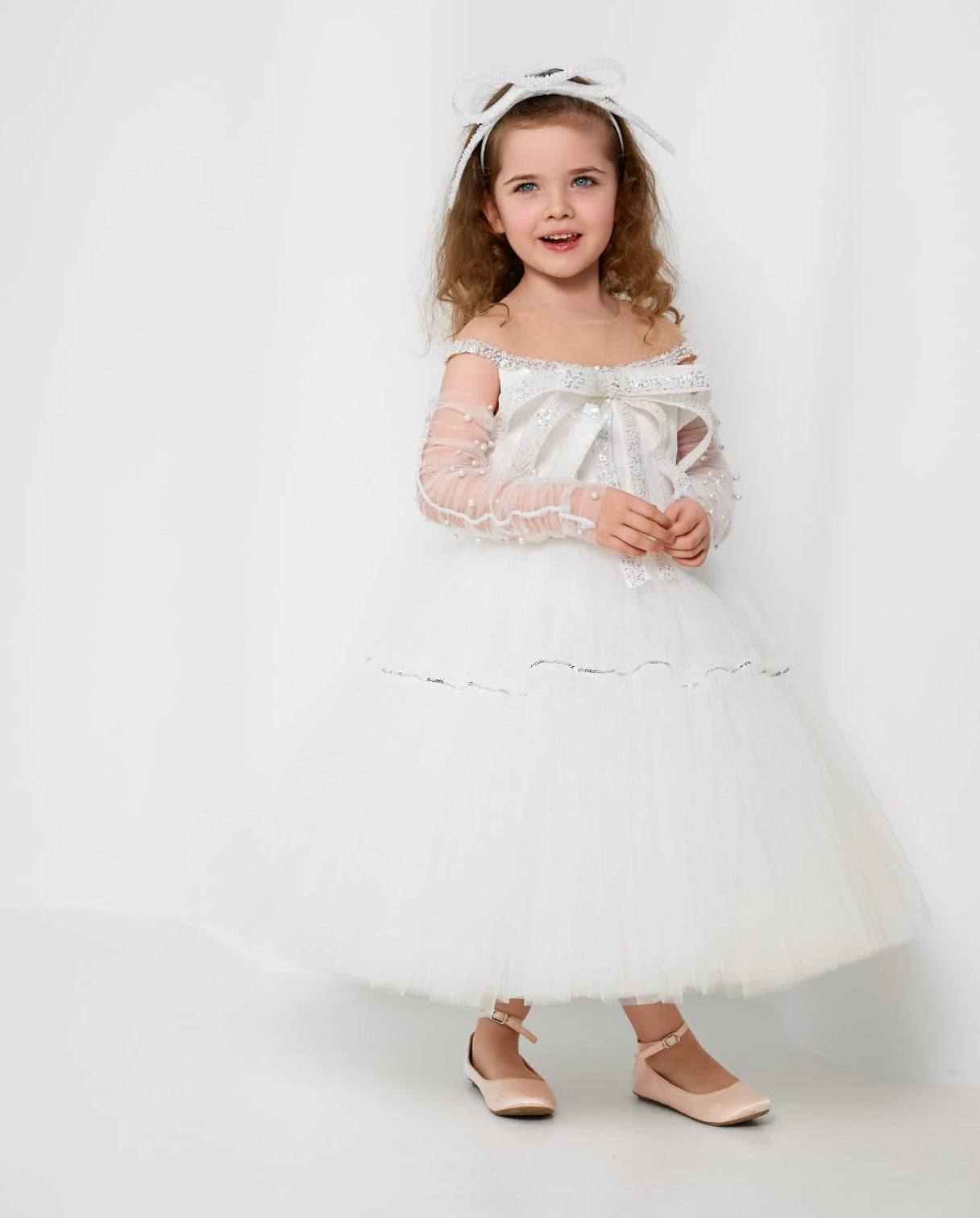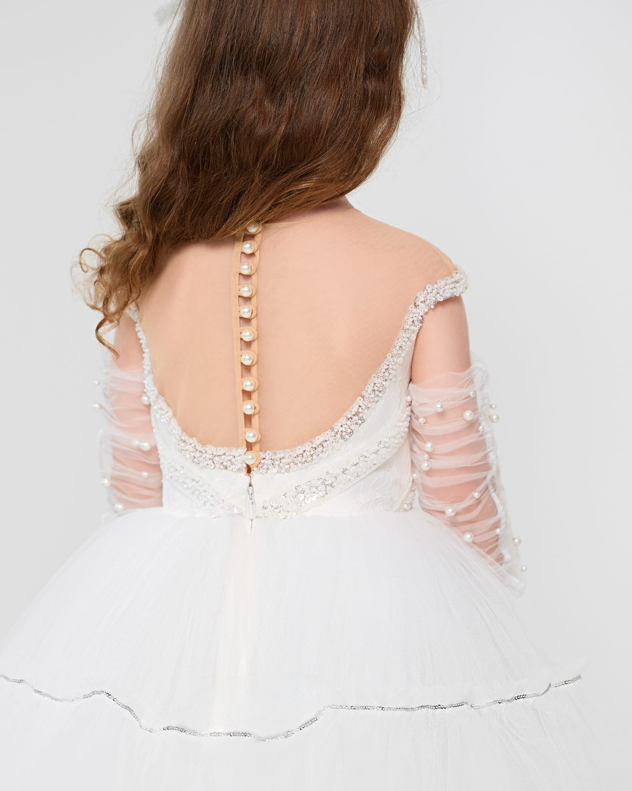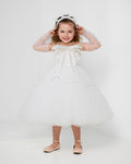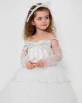 This charming mini bridal dress showcases a taffeta bodice with 3D embroidered ribbons, creating a beautiful modern illusion. Skin-tone tulle around the shoulders and back ensures all-day comfort. Designed with a full puffy skirt, pearl-button zip closure, and a coordinating headpiece.
