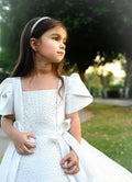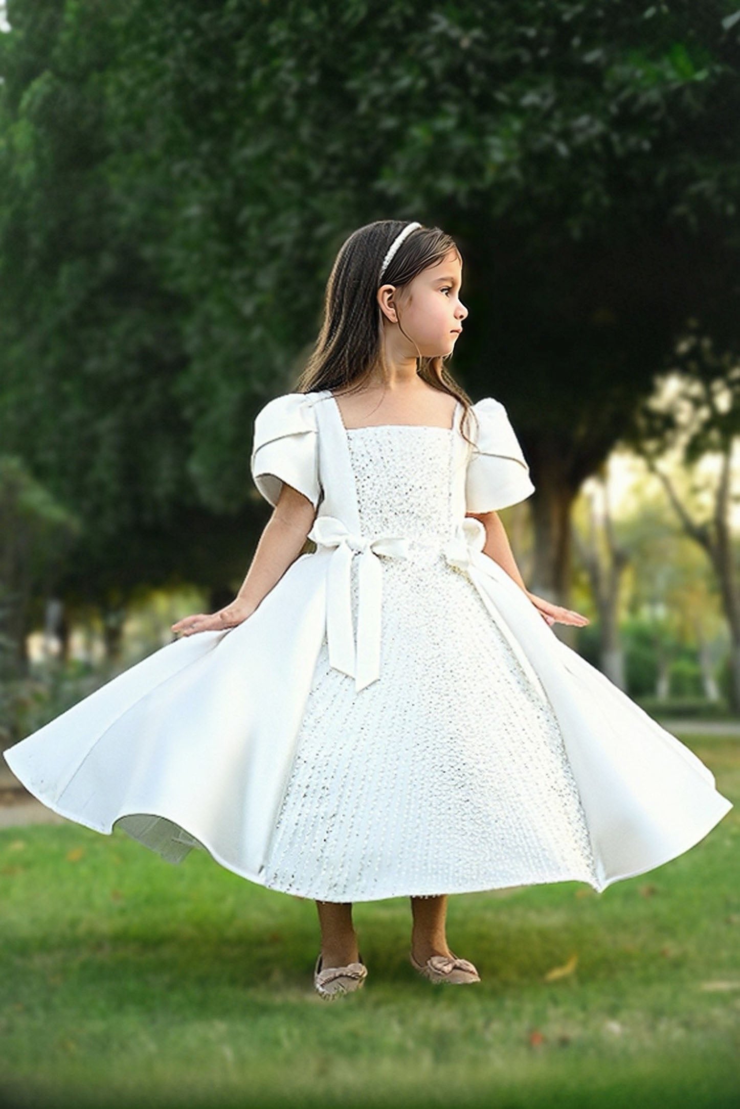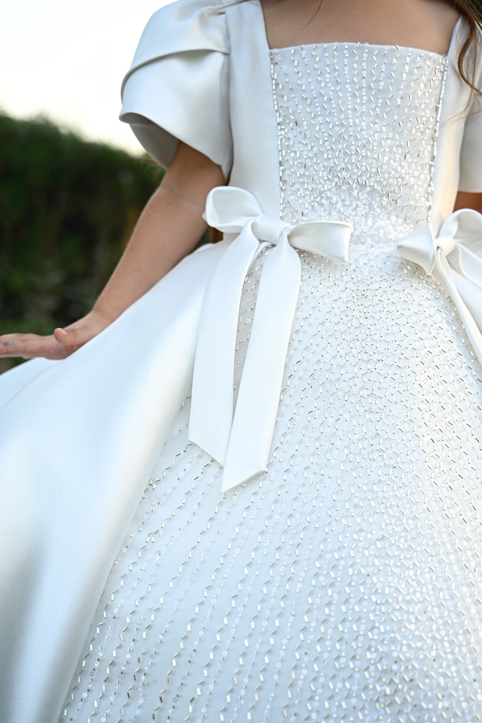 White taffeta puffy gown, featuring beautiful beaded front and tulip sleeves. An inbuilt petticoat gives the dress a volume.