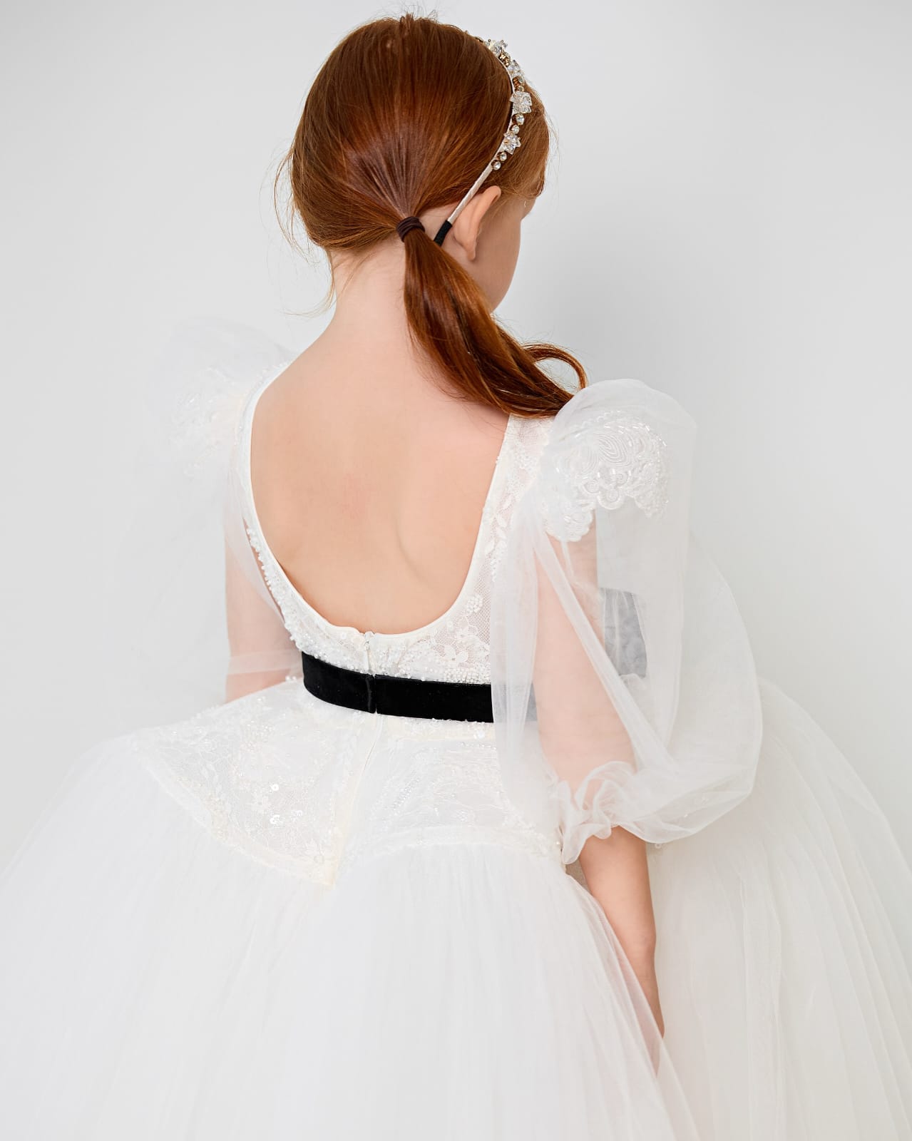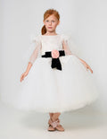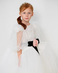 This stunning mini bridal dress showcases embroidered French lace at the top and beautiful 3/4 layered sleeves. A one-of-a-kind skirt is complemented by a black velvet waist bow and a pale pink rose detail. Designed with an open back and an easy zip closure.